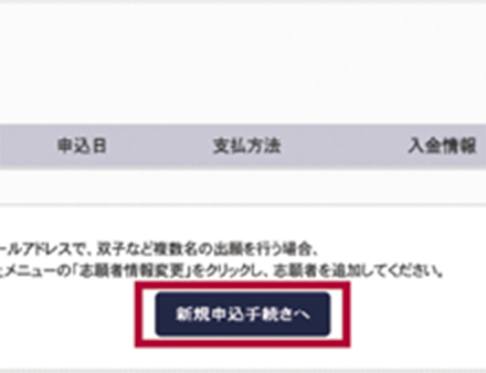 志願者を選択した後、マイページから「新規申込手続きへ」をクリック。