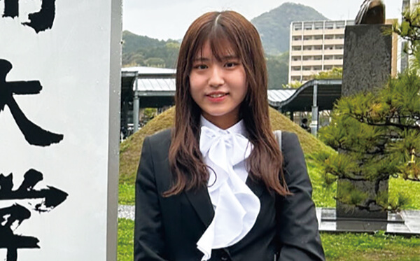 大学では日本の法律と国際法を学んでいます。九州高校では一緒に努力できる仲間やサポートしてくださる先生など周りに支えられ、人の優しさや「コツコツがんばることは無駄にならない」ことを学びました。準特進は行事も部活動も勉強もがんばれる「やりたいことが叶えられる」クラスです。体育祭や文化祭、多様な部活動など楽しいことがたくさんありますよ!