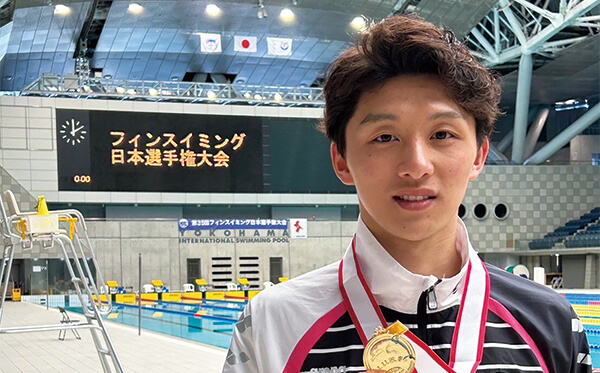 現在、大学で力を入れているのはフィンスイミングです。九州高校のよさは、勉強も部活動も、不得意な分野に目を向けて指導してくださる先生、それを応援し合える生徒の雰囲気だと思います。各々の目標に立ち向かう仲間も沢山います。仲間の存在、支え合える関係は大きな力になります。ぜひ、仲間と切磋琢磨し、活躍してほしいです!