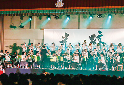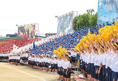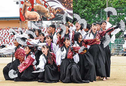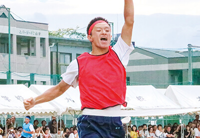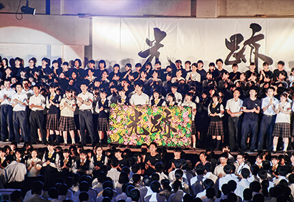 九高の体育祭は迫力がすごいと地域でも評判です。九高ならではの体操を楽しみ、ブロックに分かれての真剣勝負に手に汗握る。フィナーレを飾る、応援団部・吹奏楽部・チアリーディング部と一体化した集団演技「学校応援」は、感動さえ呼び起こします。